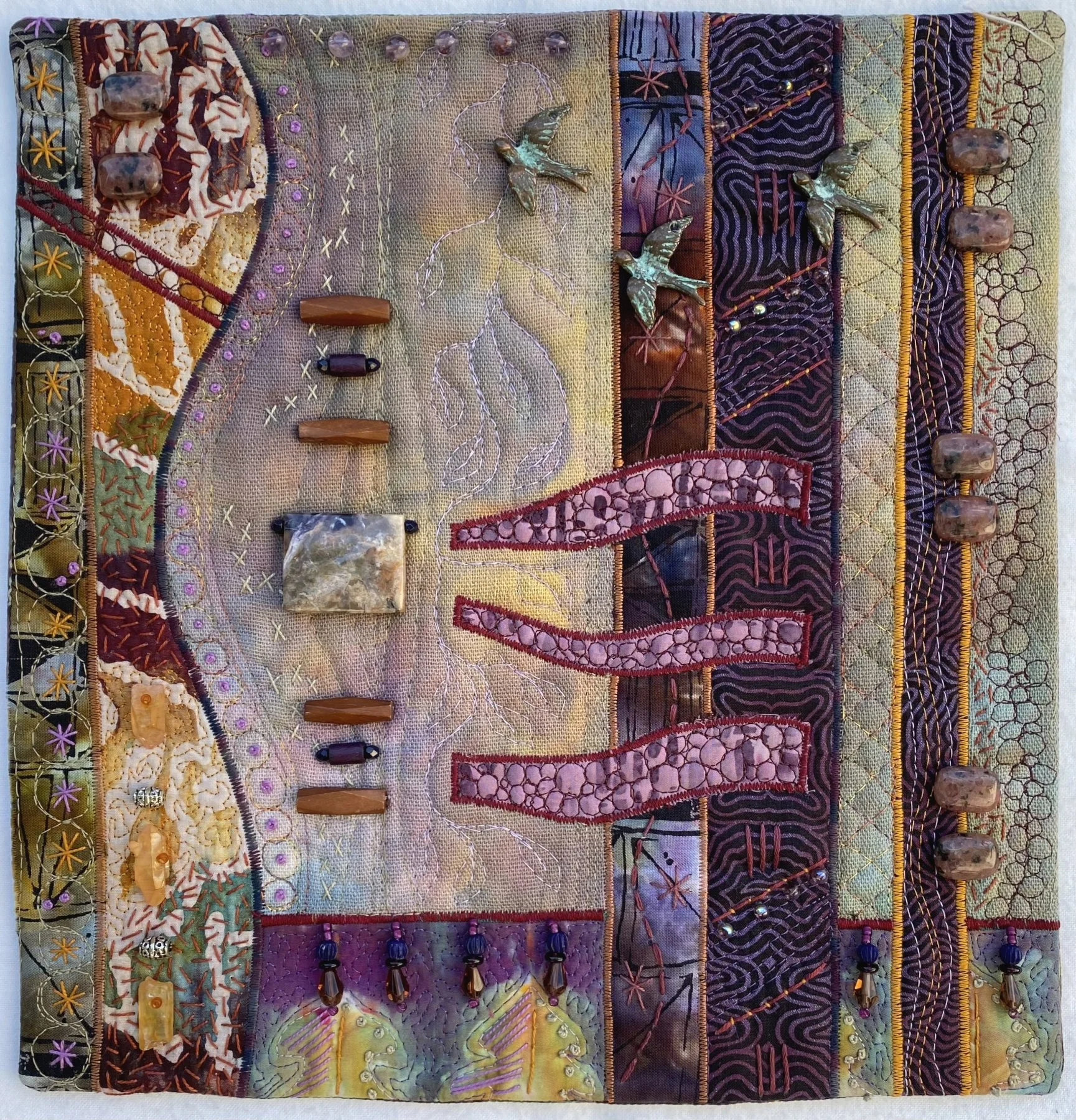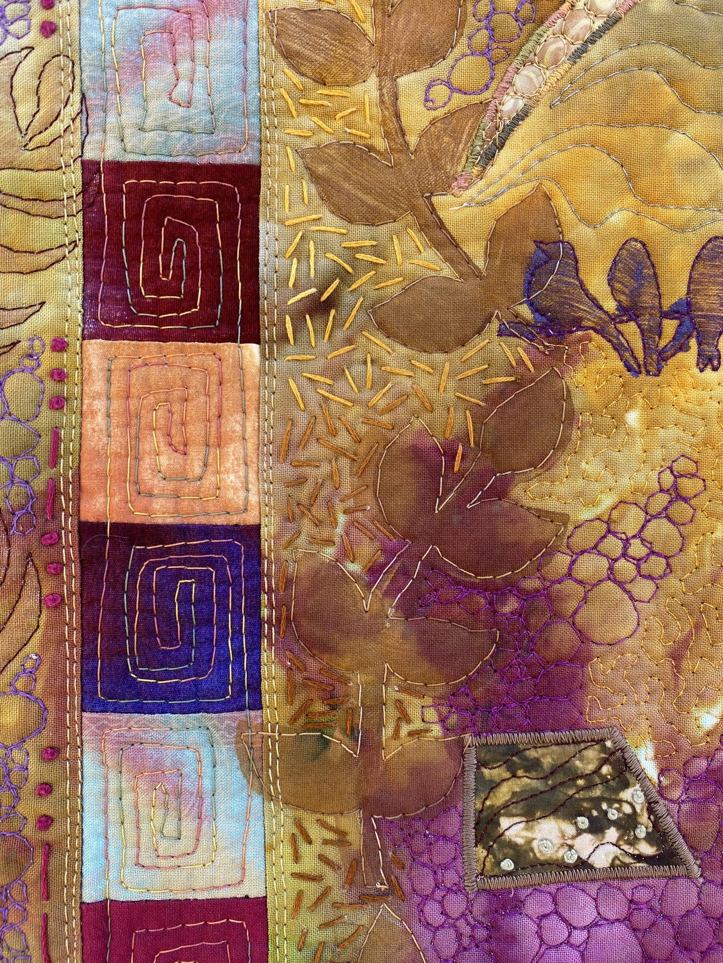 My work is mostly an abstract collage style with free motion machine quilting—meaning the designs and lines are all guided by my own hand. Frequently I add elements of embroidery, beading, couched yarns/fibers and various surface design techniques like stamping. I use various techniques/materials to add imagery from nature into my quilts. Recent work has incorporated my own ice dyed fabrics, but many pieces are still inspired by commercial textiles that I love from my collection.