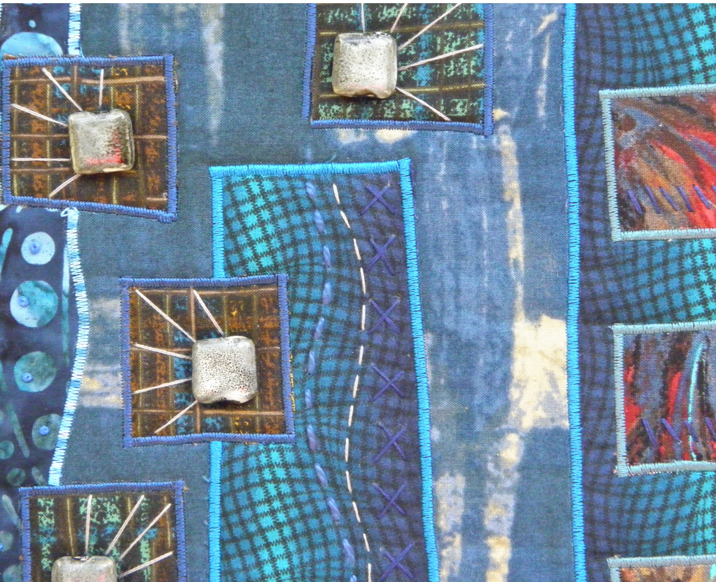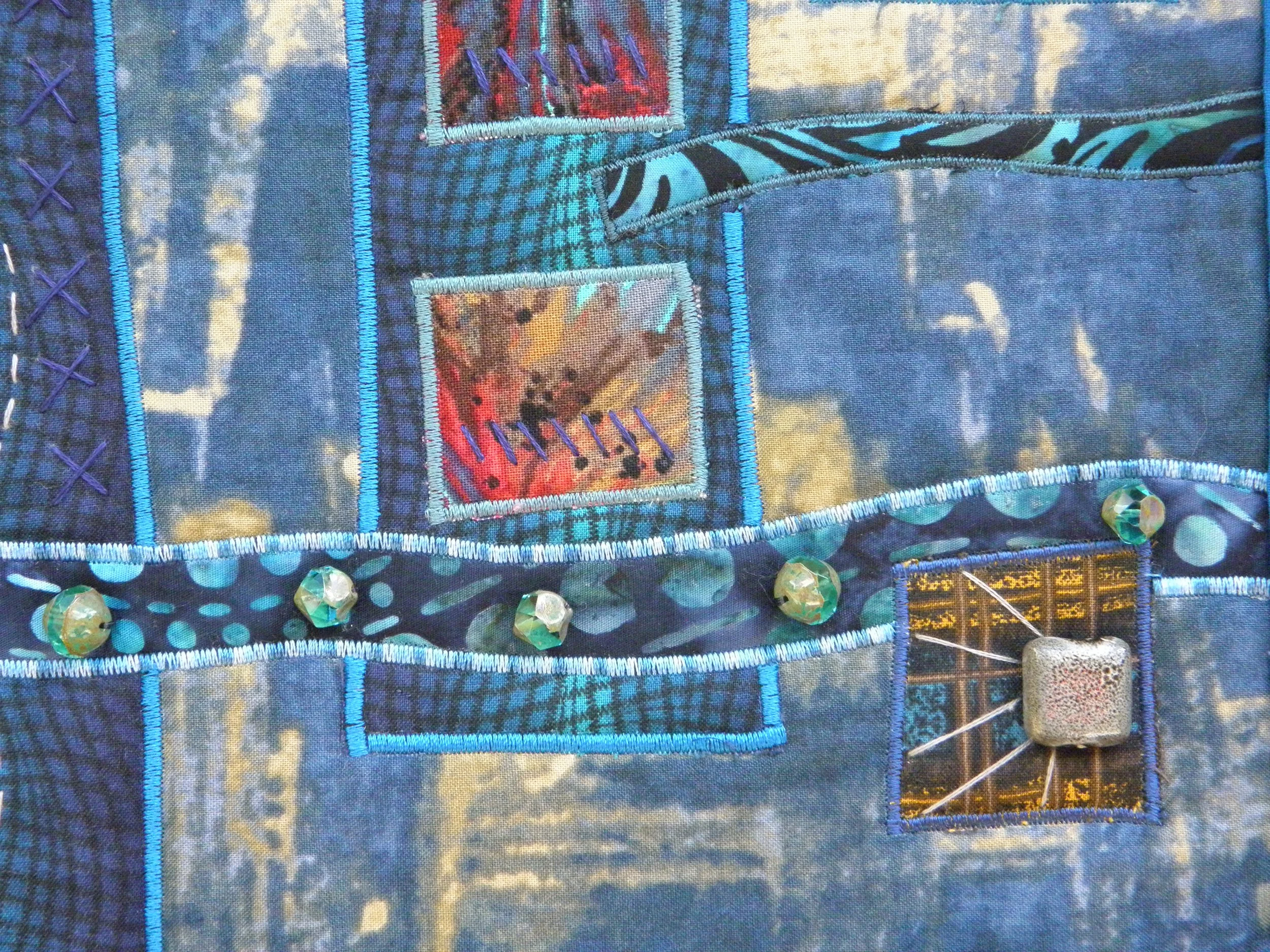 The first quilt I created for my color wheel series of twelve 12”x12” monochromatic art quilts. This small abstract collage is made with commercial fabrics, quilting, a touch of embroidery and beading. They were exhibited as a group in galleries and as a special exhibit at a national quilt exhibition in Springfield, IL, and a number of them have found new homes. I actually would call them “mostly monochromatic” as I tend to add touches of other colors to make them more exciting!
