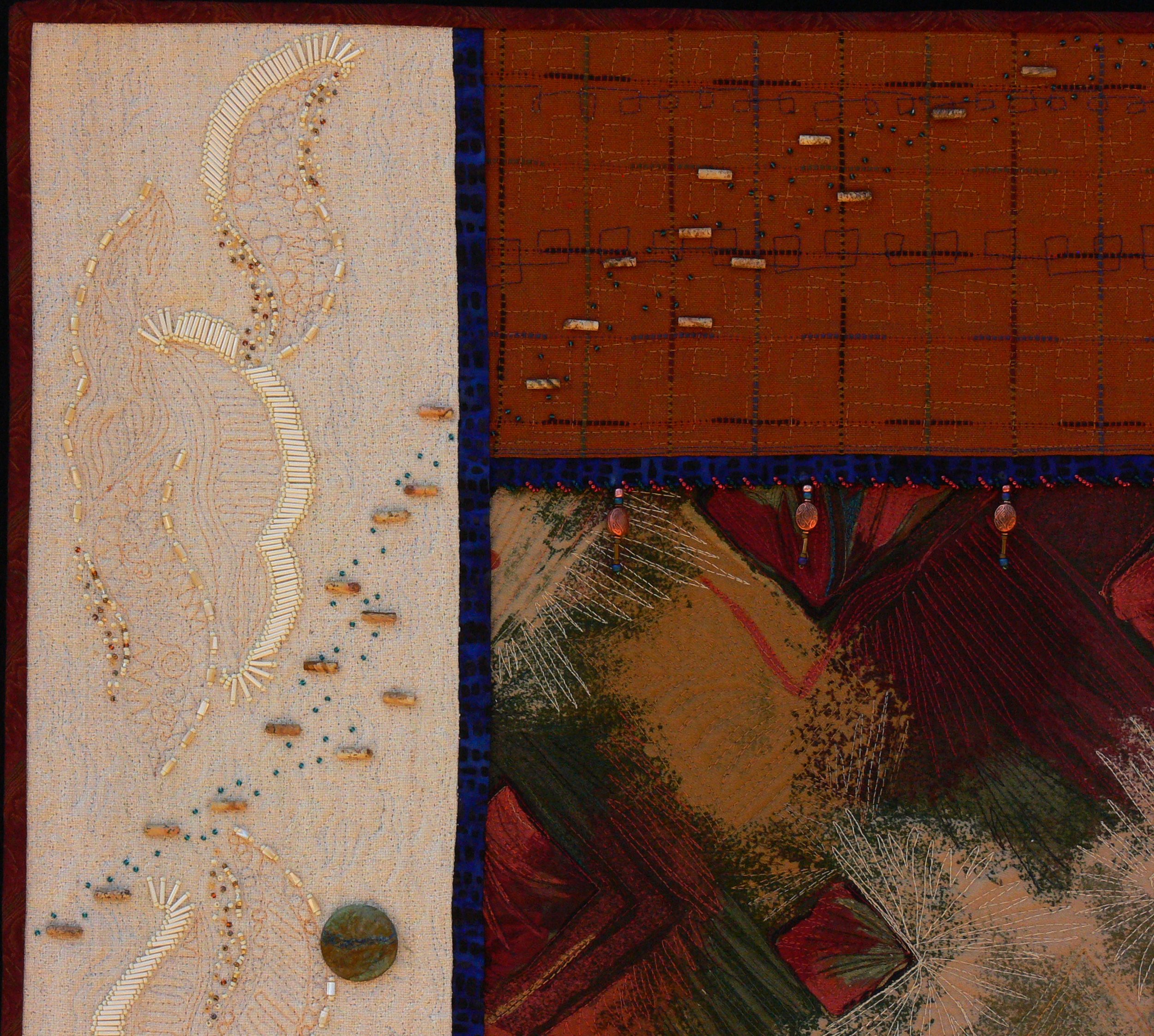 This pieced wallhanging has cotton and raw silk fabrics in simplistic design which is made more complex by the addition of dimensional elements including beads. Intense beading on the silk is the highlight of the work. This piece has received a number of awards in fiber art shows in the U.S.