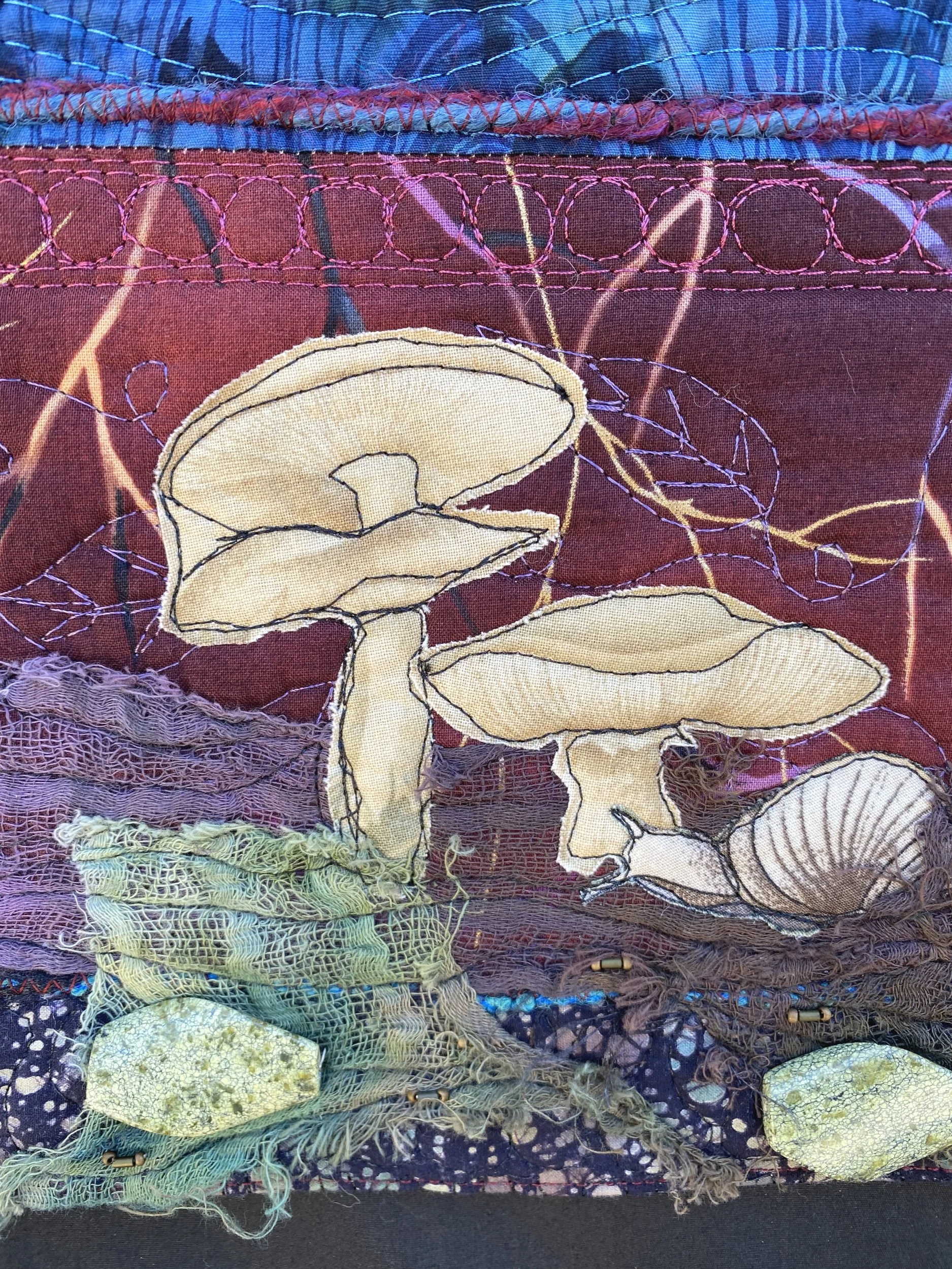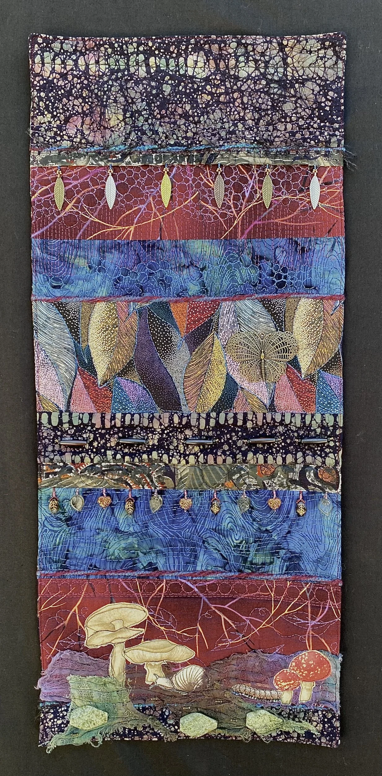 One of my tall narrow “Strata Art Quilts” which feature interesting and complimentary fabrics combined in a harmonious way. Strata quilts are a great statement for narrow wall spaces. This one has appliqued imagery and beading to emulate the colors and textures of the forest floor.