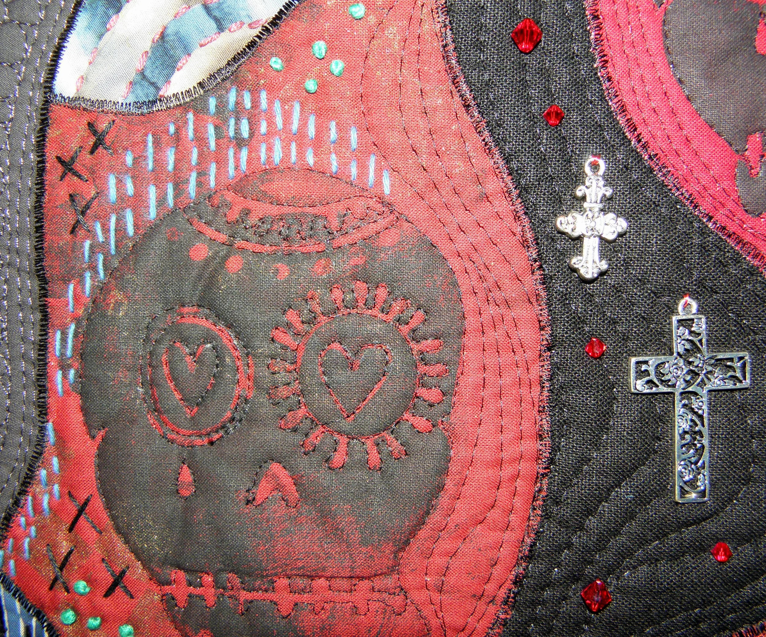 This was made for a Day of The Dead exhibition at the Visions Museum in San Diego, CA in 2019. I used fabrics and a skull stamp that I had acquired on a recent trip to New Mexico and created this collage. Free motion quilting, embroidery and beads/charms were added.